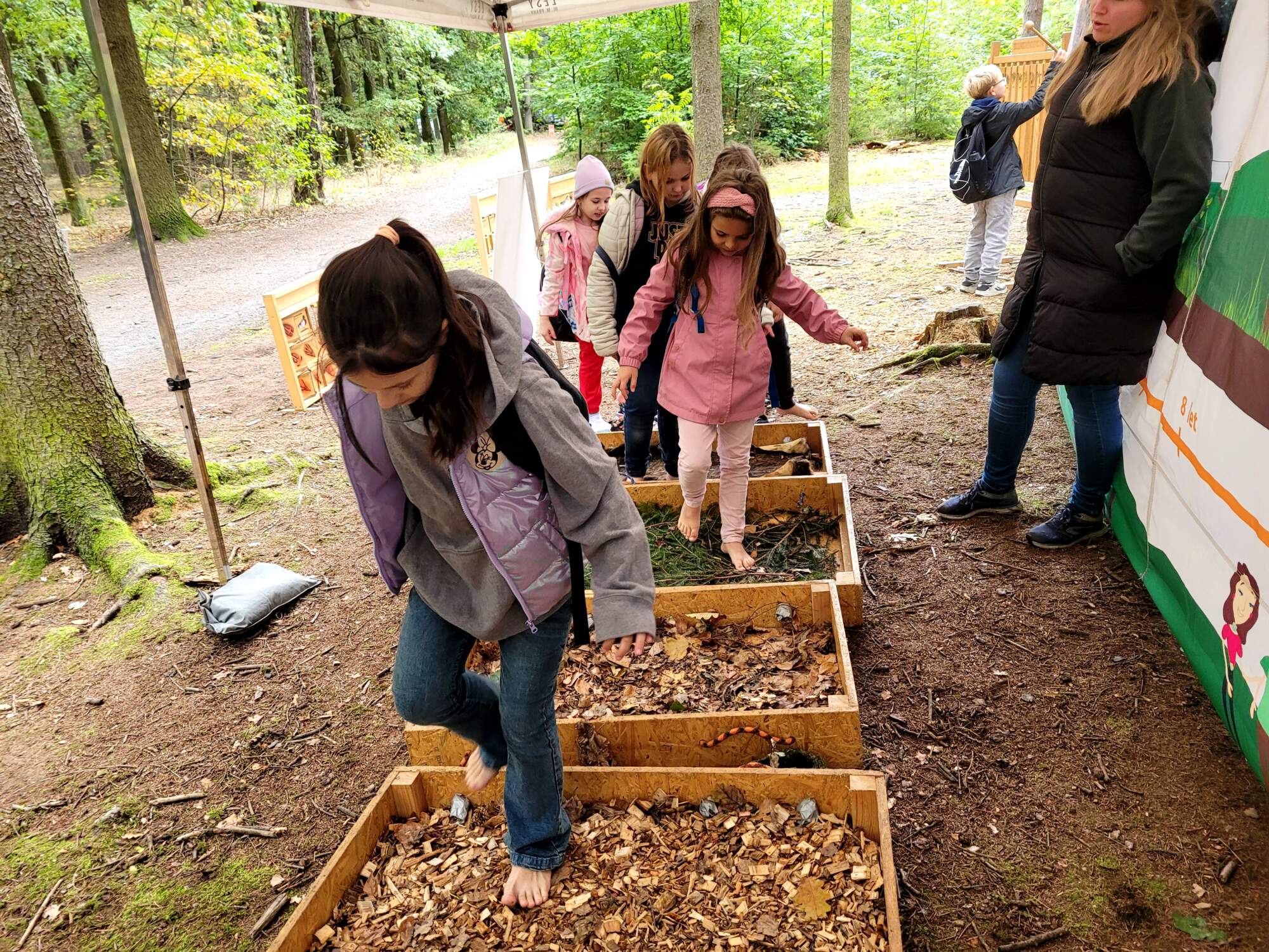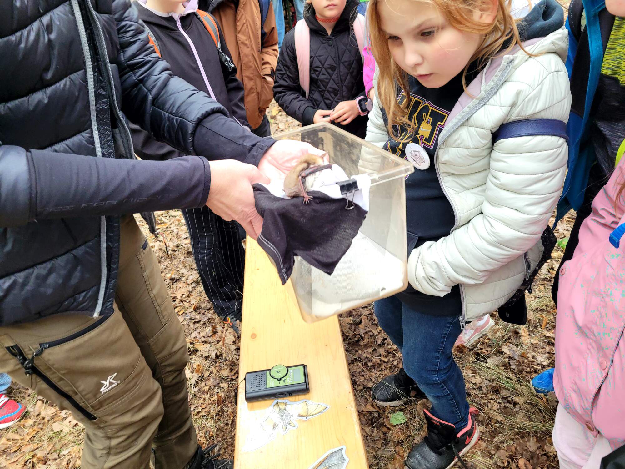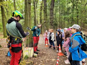 Součástí dne byla také tvůrčí dílna, kde si každý vyrobil placku se zvířecím motivem na batoh. Zblízka jsme sledovali i práci odvážných dělníků, kteří se pomocí lana dokážou vyšplhat až do korun stromů. Nechyběly ani kvízy z naučných stezek, měření výšky stromů, ukázka práce záchranné stanice pro zvířata, setkání s netopýrem a představení, jak v lese pomáhá kůň.